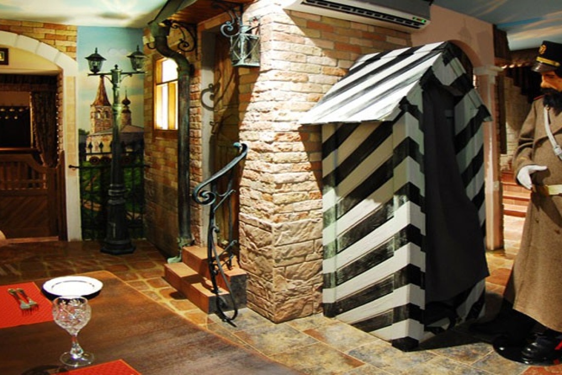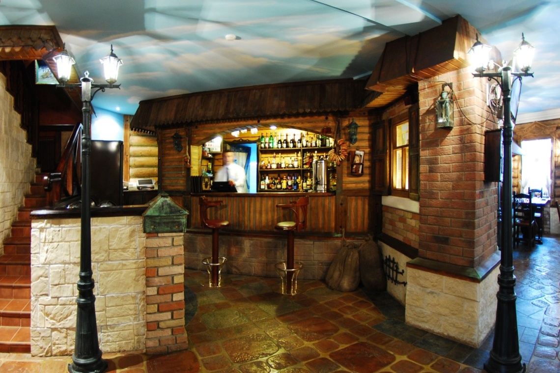 Эта зона выполнена в неповторимом стиле старинных суздальских улочек. Несмотря на колоритность интерьера, уголок получился уютным, располагающим к спокойному отдыху и длительным беседам. Здесь можно не спеша насладиться блюдами традиционной русской кухни и отведать самые разные напитки. Например, медовуху, приготовленную по рецепту купца Василия Жинкина. Самобытное оформление зала с льющимся из нарисованных окон теплым светом очень умиротворяет.